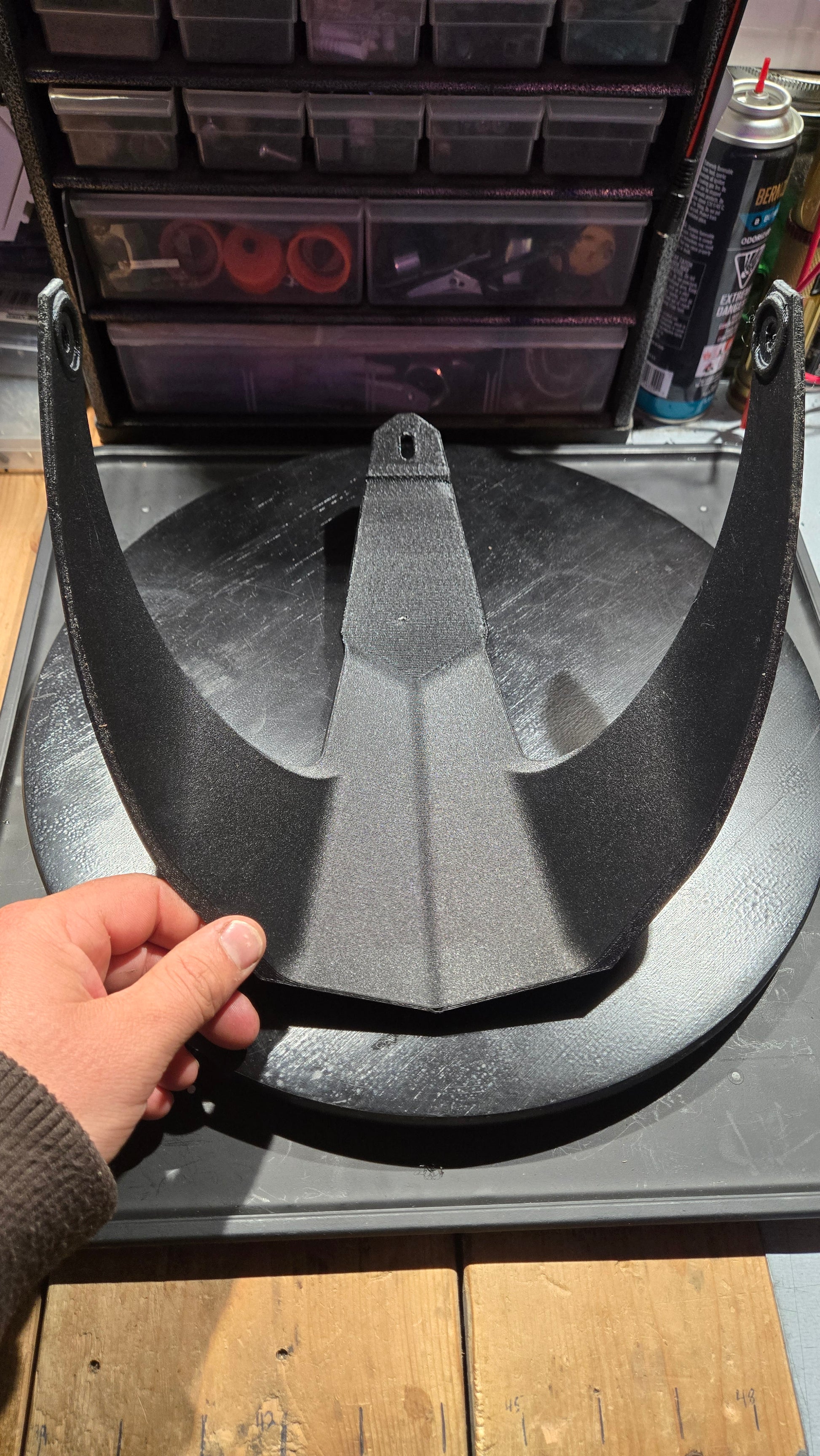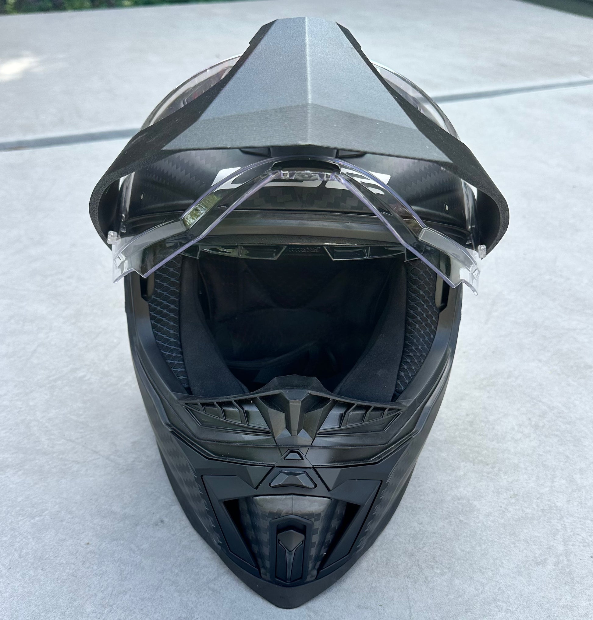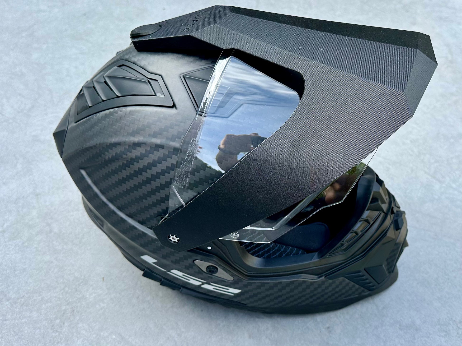 This is the result of a customer project request to replace the stock OEM peak with something a bit more sturdy that can handle high speeds. We can produce this in a variety of colors or materials, so use the contact form for specific requests and we'll see if we can get you your preference. It features a breakaway ridge up top so in the event of a head accident, it just breaks away.